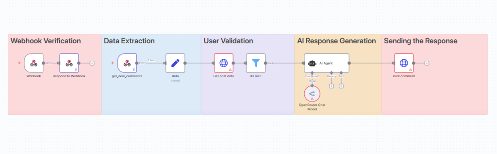 Automation Platform: n8n workflow engine (v1.88.0+) Machine Learning: OpenRouter API with language model integration Social Platform: Instagram Graph API (v22.0) Authentication: Facebook Developer credentials and OAuth implementation Infrastructure: Webhook-based event system with modular processing nodes Security: Request verification and payload sanitization Data Handling: JSON processing and structured field extraction